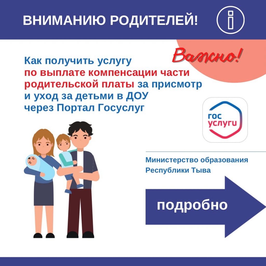 🔥 Уважаемые родители! Теперь Вы можете подать заявление на выплату компенсации части родительской платы за присмотр и уход за детьми в дошкольном учреждении через Портал Госуслуг https://www.gosuslugi.ru/ !